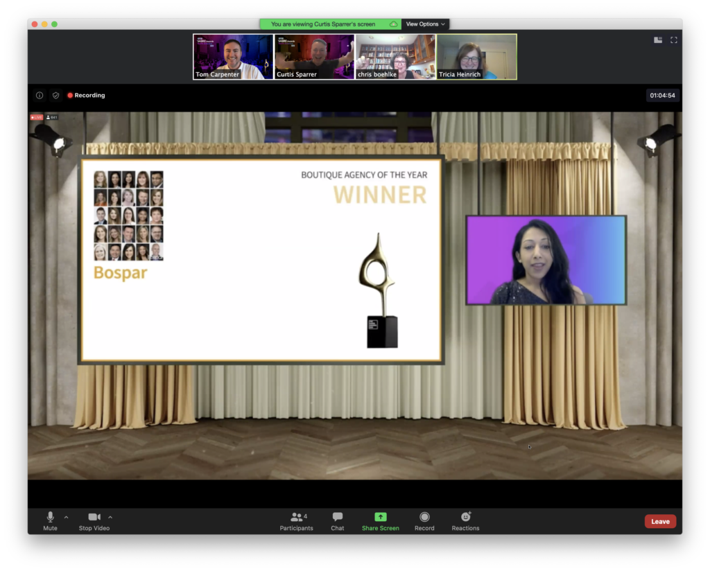 Principal Tom Carpenter said, “We work diligently to get the results that matter to our clients, and that is the basis for our being named an agency of the year.” He added, “Even though we were ‘attending’ from our homes, it was a thrill to hear the Bospar name announced – virtually – as a winner.”